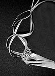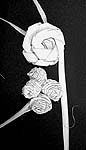 Beginning at about 2" from the base, fold one leaf back, slanting 45° to the left (1), fold the other leaf back, again at a 45° angle under it (2), fold the first under again continuing in in a counter-clockwise motion, bringing the "rose" as it is now appearing, over the front of the stem (3). Since the palm is tapered, the rose begins to become smaller as you continue. When you feel you have a nice rose, secure the center with a pin or inserting the ends into the weave. You can either trim the ends, or let ends spin off. The center of the rose can be decorated with sequins, a tiny ribbon, or just a knot. It does not need to be decorated if done well. Roses look nice alone or in a bouquet of roses. A palm rose bouquet is welcome as a gift to the person who has everything money can buy! If hung on the wall, the roses can open and hang down, forming a nice spiral. Some leave the folds tufted, not pulled tight, for a rounded effect.