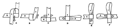 1. Cut 2 strands of palm about 1/2" x 14". Place the ends of the 2 strips together to form a right angle. Bend #1 down and around the back to make a loop around #2.