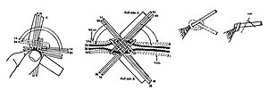 Take 4 strands connected at the bottom. Begin by bending one strand away from you (pointing north), another strand over this and pointing to your left (pointing west), another strand over this toward you (pointing south). The last strand will point to your right and be placed over the 3rd and under the 1st (pointing east). Thus you have a strand going in each direction and are ready to weave.