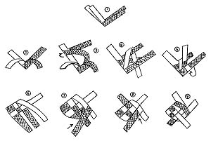 1. Double one piece and insert the middle of the other piece inside the fold, thus dividing the piece into 4 strips.
